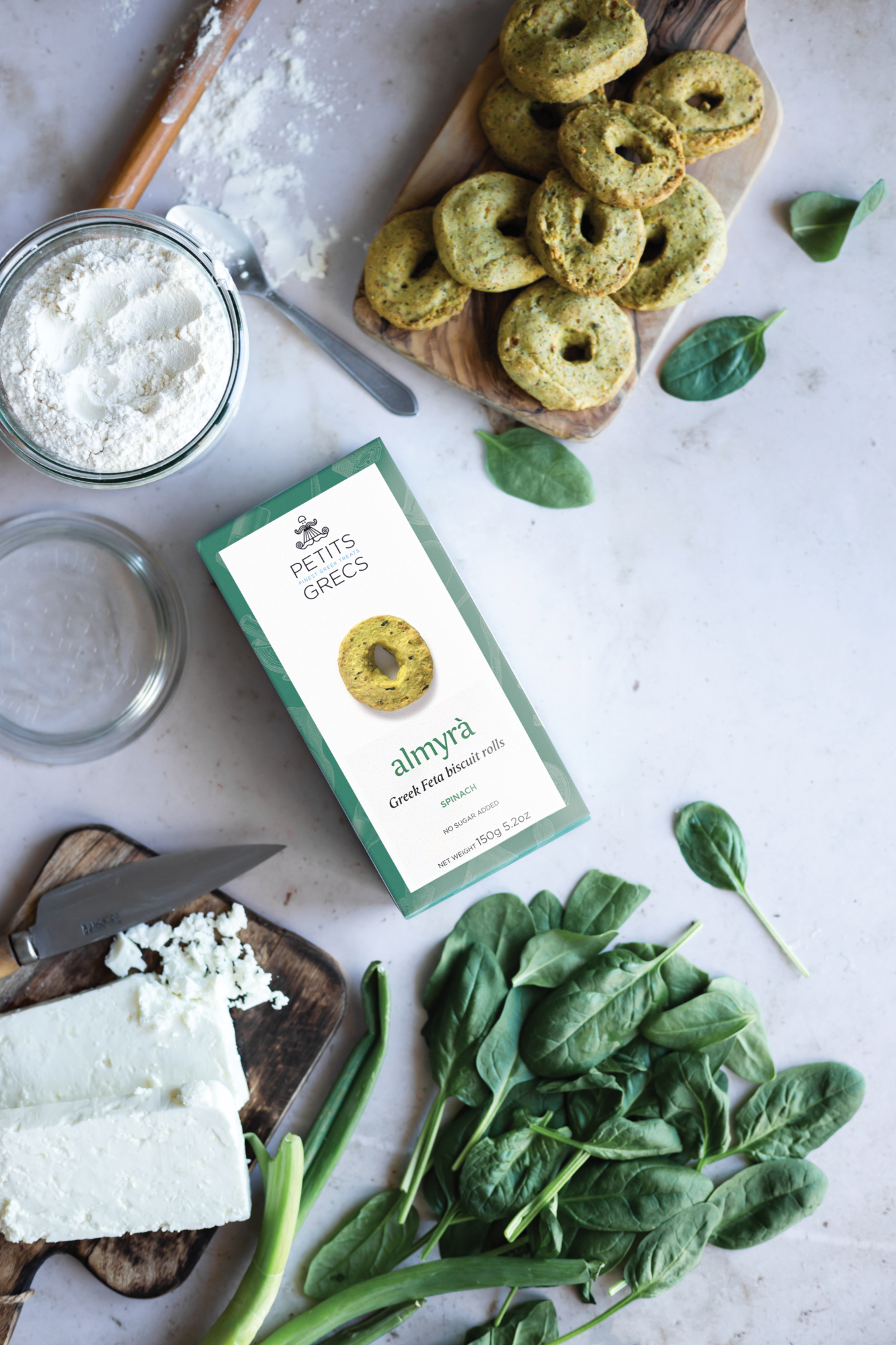 Συστατικά: Αλεύρι Σίτου, Φυτικό έλαιο (έλαιο καρύδας, αλάτι, αρωματικές ύλες), Τυρί Φέτα 13%, Αυγό σε σκόνη, Σπανάκι Αποξηραμένο 0.6%, Αλάτι, Διογκωτικές Ύλες (δισόξινο πυροφωσφορικό νάτριο, όξινο ανθρακικό νάτριο), Κρεμμύδι Αποξηραμένο, Πιπέρι Μαύρο.